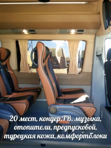 Базовый фургон: Евро 5, двигатель, 110кВт/150лс,3800об., система курсовой устойчивости (ESP9i), гидравлическая 2-контурная тормозная система, с ABS, ASR и EBV, подушка водителя, ассистент торможения (BAS), ГУР, иммобилайзер, цз с диступравлением, мех КП ECO Gear 360 6-ступенчатая, цифровой тахограф EC, тахометр, запколесо, шины 195/75 R16 C., сиденье водителя регулируемое. ТУРЕЦКИЙ ДИЗАЙН: количество мест 20+1 водитель, стеклопакет, теплоизоляция салона(северный вариант), панели оклеиваются перфорированной кожей, перегородка за водителем, подиум, светодиодная подсветка подиума и потолка, кресла комбинированные кожа пр-во Турция, откидные с высокой спинкой повышенной комфортности с трёхточечными инерционными ремнями, отопитель ОС-7, автономный воздушный отопитель Вебасто 5 кВт., догреватель штатный, кондиционер Алекс 8,5кВт, TV-19 дюймов, DVD магнитола 2-х Din Pioneer с монитором, багажные полки с сервис блока, (подсветка,колонка, освещение), люк (стекло), (три люминесцентных светильника), покрытие пола Линавто, сигнализация с обратной связью, шторы, тонировка, багаж под задним рядом, ээлектропривод двери. Срок производства 30 дней. Гарантия - 2 года!