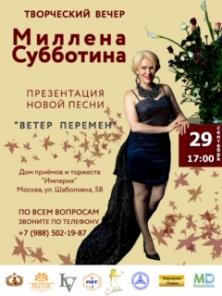 Концерт "Ветер перемен" в Москве Мелодии, написанные от души, текст, который заставляет нас задумать о жизни, об отношениях, о любви, о том, что и кто нас окружает.Голос в 5 октав. Все это – творчество Миллены Субботиной – музыка для души.