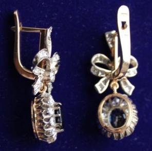Серьги золотые с сапфирами и бриллиантами Роскошные женские серьги – бант Фаберже с бриллиантовой россыпью и подвеска с сапфиром в обрамлении бриллиантов, золото 583 пробы, вес 9,08 гр, натуральные природные сапфиры (2 сапфира общим весом 1,95 кар. 2/2) и 54 бриллианта общим весом 1,60 кар. 3/3.