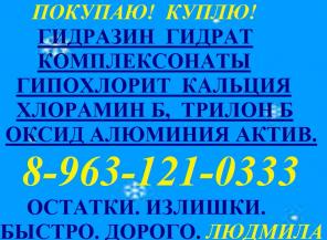 Куплю хлорамин Б. Покупаю гипохлорит кальция с любым процентным содержанием. Покупаю складские остатки и излишки. Куплю хлорамин Б. Куплю железо хлорное техническое. Гидразин гидрат куплю излишки, остатки. Предложите материал в нарушенной упаковке. Самовывоз со всех регионов РФ. Работаем с Казахстаном. Звоните