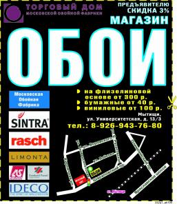 Обои магазин Наш магазин открылся после капитального ремонта в феврале 2007 года. Теперь современный и просторный зал располагает к неспешному, обдуманному выбору. В зале представлен широкий ассортимент бумажных, виниловых обоев, а также обоев на флизелиновой основе.