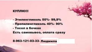 Куплю Этиленгликоль,Пропиленгликоль,Охлаждающую жидкость Куплю Этиленгликоль 50%-99,9%, тосол в бочках, антифриз в бочках, хладоноситель пропиленгликоль 40%- 99%